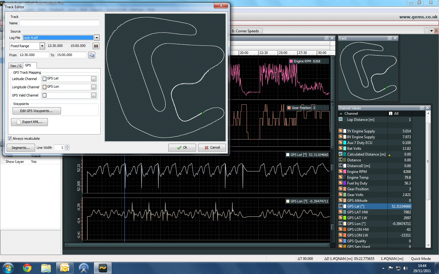 Your car have a major difference on mine : the GPS is connected to the MOTEC ECU, and then transmit by CAN to the Gems logger. May be some informations should be usefull