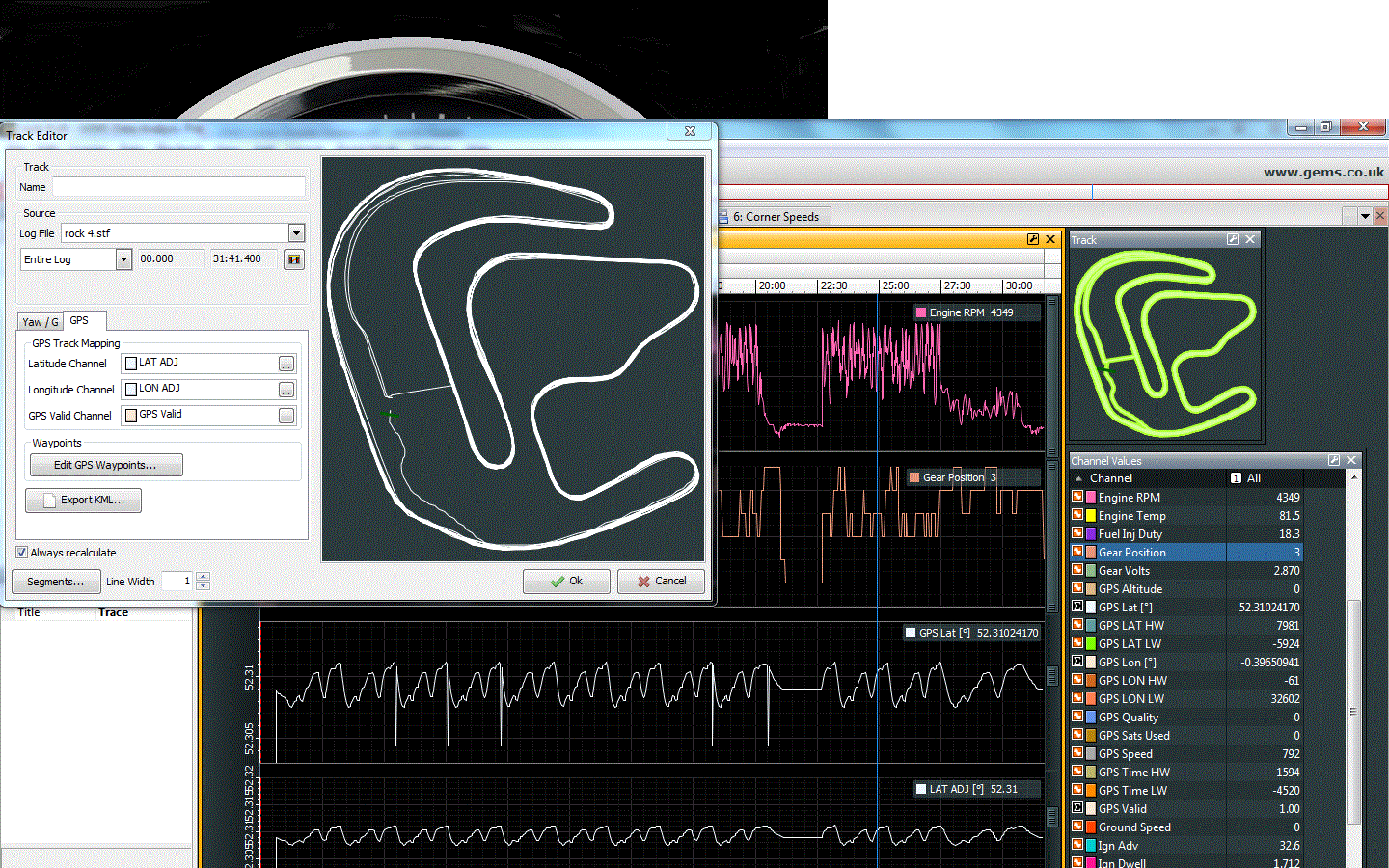Hey-presto the plots 'line free' for the whole log! Have a look at the screen print and tell me what you think. It shows pits to track, back to pits and out again to finish, as does the log. Of course, this is really 'shutting the stable door after the horse has bolted' as all I've done is tidy up the data once logged. This would of course mean that a new math calculation would have to be done each time the venue changes and the Lat/Lon figures alter. Not ideal. The answer is not to have spiked data to start with (which I notice happens at the same point in most laps). I'm wondering if signals were erratic due to external features of the circuit. I had one or two signal losses in the Golfs MkII's we race when we came to Rockingham and discovered that if I didn't pass under the Start/Finish gantry, the problem went away..! Go figure!